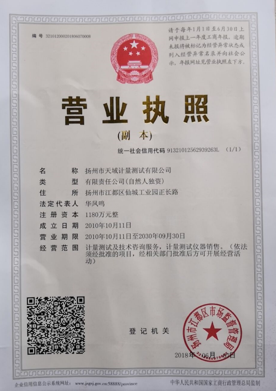 揚(yáng)州市天域計量測試有限公司,坐落在交通便利的揚(yáng)州市江都區(qū)仙城工業(yè)園,成立于2010年10月,2011年11月正式獲取中國合格評定國家認(rèn)可委員會認(rèn)可(授權(quán)),注冊號:CNAS L5296。近幾年的發(fā)展,實(shí)驗(yàn)室已具備了較大規(guī)模,并形成了集計量器具檢測,計量技術(shù)咨詢和計量器具銷售為一體的專業(yè)化技術(shù)機(jī)構(gòu),客戶覆蓋蘇南、蘇北、和浙江,安徽部分地區(qū),客戶群總量達(dá)到了上千家企事業(yè)單位。實(shí)驗(yàn)室建立健全了一套較為完整的內(nèi)外部質(zhì)量管理體系,至今未發(fā)生糾紛和客戶投訴事件。